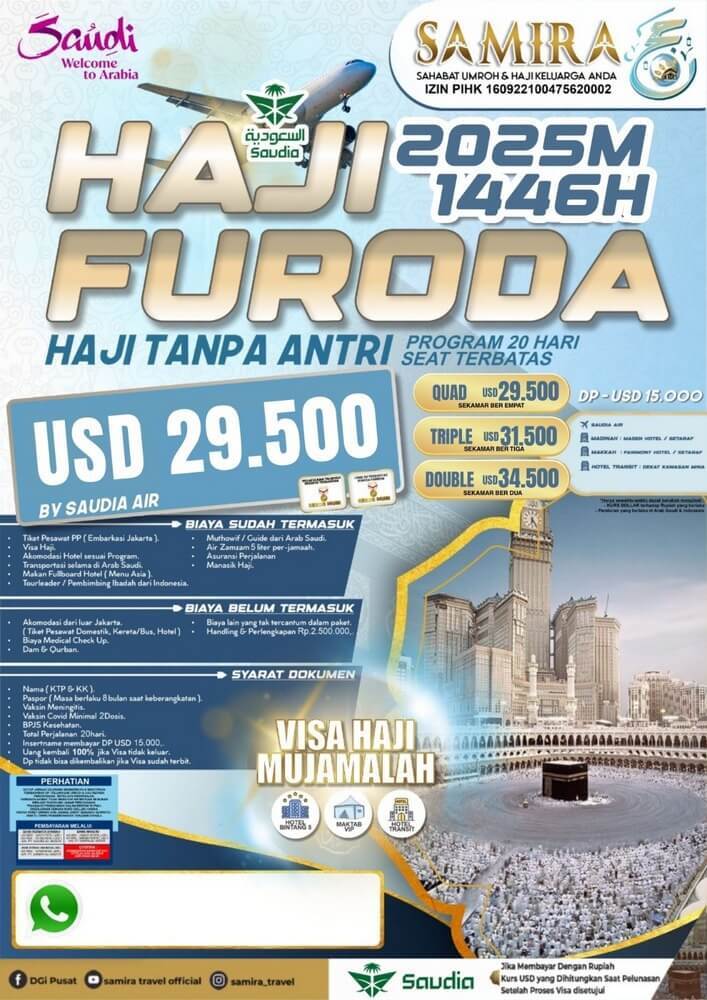Dengan Harga promo mulai dari 26 jt an. atau DP 7 JT Bisa langsung Berangkat UMROH, dengan Pembiayaan Syari’ah.